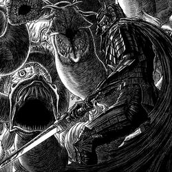 Zur gleichen Zeit setzt Guts seinen Weg durch den Körper des Meeresgottes fort. Er kommt dem Herzen immer näher, dessen Lautstärke inzwischen die Kanonen der "Sea Horse" übertrifft und Guts' Körper lähmt. Der Schall behindert ihn auch beim Laufen und Atmen, als er vor dem Organ steht. Guts treibt sich selbst zur Eile an, doch Schielke bemerkt, daß das Herz plötzlich schneller schlägt.