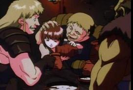 einzig übriggebliebene Söldner nimmt das Mädchen mit einem Schwert zur