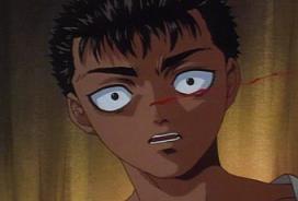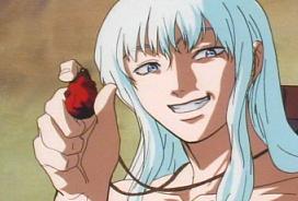 Guts bemerkt, dass der Anhänger lebendig ist, und schreckt zurück. Griffith erwidert nur grinsend: "Gruselig was?"