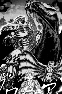 Die Pfütze entpuppt sich als Blutrinnsal, das daraus hervorsickert. Doch damit ist der Schrecken noch nicht vorbei. Über Rikkelt raschelt es im Geäst und als er nach oben sieht, steht das Elfenwesen auf einem Ast. Es gibt den Insekten ein Zeichen, die sich sofort auf den Jungen zu bewegen. Dieser muss feststellen, dass er sich plötzlich nicht mehr bewegen kann, zu tief sitzt der Schock. Er ist kurz davor, mit dem Leben abzuschließen, als hinter ihm eine weitere Gestalt auftaucht. Der Totenkopfritter, hoch zu Ross, zieht sein Schwert und gebietet den Monstern Einhalt. Er erinnert sie daran, dass die Zeit drängt und sie es sich nicht erlauben können, sich mit Morden aufzuhalten. Kurz zögern die Monster, doch nach und nach ziehen sie sich zurück. Als auch das letzte fort ist, löst sich endlich Rikkelts Starre. Er bricht weinend zusammen und realisiert, dass alle, die bis eben noch so fröhlich darauf gewartet hatten, dass Griffith wiederkommt, nun tot sind.