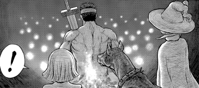 Auf dem Bankett zu Ehren der Gefährten herrscht eine ausgelassene Stimmung. Wesen, Zauberer, Hexen und Menschen feiern zusammen. Isidro erzählt mit viel Getöse von seinen Heldentaten, während eine stark angetrunkene Isuma einfach ihren Fischschwanz auf den Tisch knallt, um zu beweisen, dass sie eine Meerjungfrau ist. Magnifico und Puck haben dagegen wenig Spaß. Sie sind für das dreckige Geschirr zuständig. Nur Guts hält sich den Feierlichkeiten fern und denkt nach. Bald gesellen sich Serpico und Roderick zu ihm, um ihn ein wenig aufzumuntern. Er sei nun am Ziel seiner Reise angelangt, nun soll er die Dinge auch einmal anderen Menschen überlassen. Das sieht Guts ein, doch erkennt er auch, dass sich vieles verändert hat. Als er alleine war, konnte er mit seinem Leben rücksichtslos anfangen was er wollte. Dann hatte er Kjaskar bei sich und plötzlich war es gar nicht mehr so einfach, sein Leben in die Waagschale zu werfen. Und nun hat er viele Gefährten, auf die er sich verlassen kann. Er ist dankbar dafür. Serpico vermutet, diese offenen Worte kommen vom Alkohol, doch muss er zugeben, dass es ihm ähnlich ergeht. Als er und seine Halbschwester den Rittern der Heiligen Kette beigetreten waren, hatten sie nichts anderes zu tun, was der Heilige Stuhl von ihnen wollte und alles war in Ordnung. Dann kam Guts und Farnese verlor ihren Glauben. Sie war dennoch besessen von ihm. Seit er ein kleiner Junge war, diente Serpico ihr, konnte kaum etwas anderes tun als an ihrer Seite zu stehen und plötzlich platzte ein Söldner in ihr Leben und hauchte Farnese neues Leben ein. Obwohl er oft darüber nachgedacht hatte Guts zu töten, sah er mit Stolz, dass Farnese selbständiger wurde. Er erkannte, dass das an Kjaskar lag. Jemand der einen anderen Menschen beschützen will, wächst an dieser Aufgabe. Sie sollten auf die starke Verbindung zwischen den beiden Frauen vertrauen. Nun muss auch Serpico zugeben, dass er ein wenig angeschickert ist. Worte wie diese sind auch für ihn ungewöhnlich, doch Roderick findet das in Ordnung. Er ist immerhin erwachsen und riskiert sein Leben, um für eine Frau über das Meer zu segeln. Er eröffnet, er möchte sterben, indem er im Meer, in Wein oder in Frauen ertrinkt. Er ist eindeutig betrunken. Plötzlich kommen Guts die Worte des Totenkopfritters in den Sinn, dass sein Wunsch nicht unbedingt Kjaskars Wunsch sein würde.